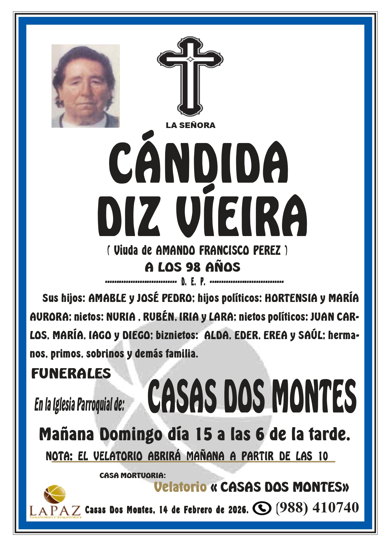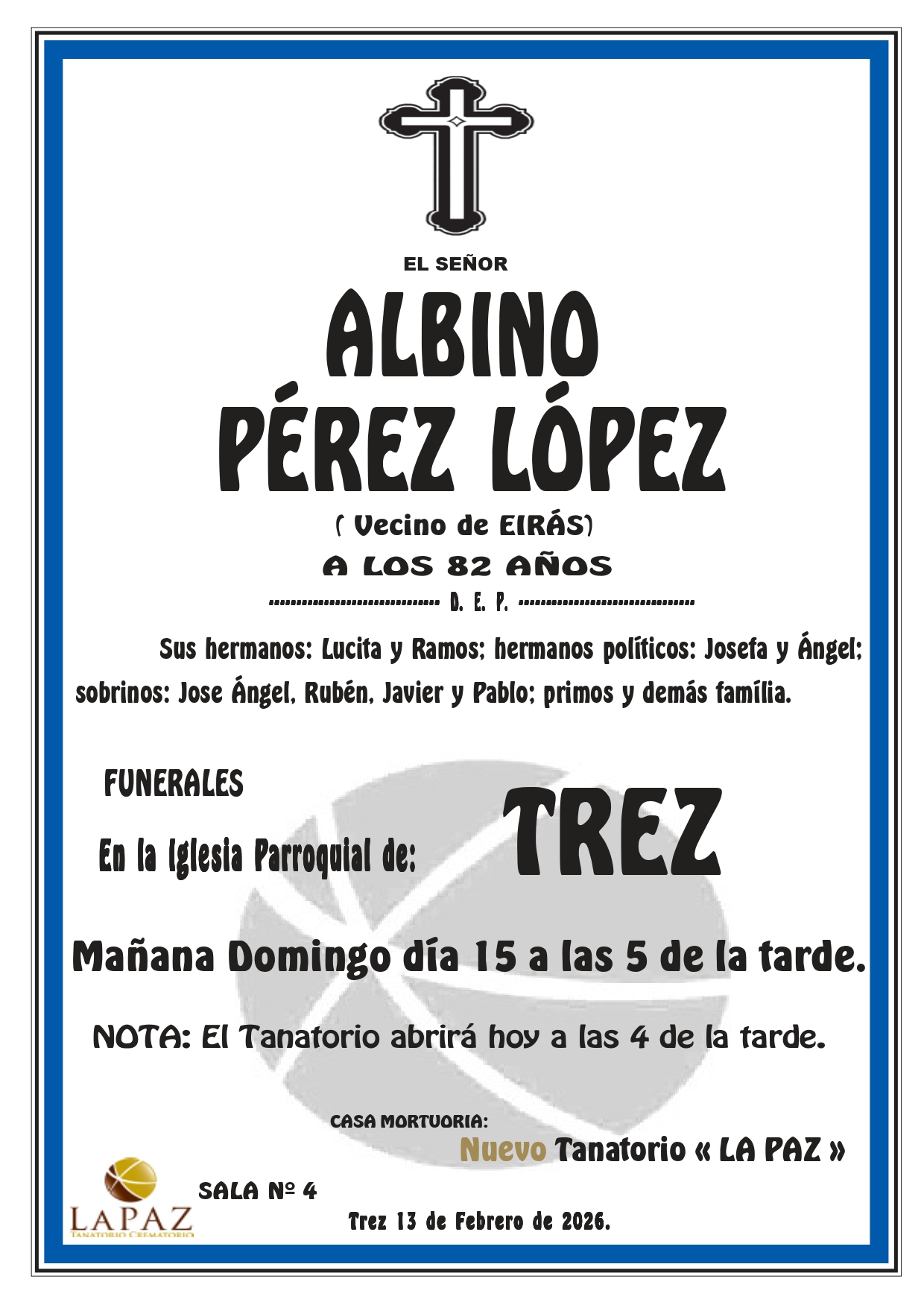 Floristería Encargos: 988 317 333 Qué hacer ante una defunción Atención 24 horas 988 410 740 Nueva aplicación de Funeraria La Paz Descarga gratuita para tu móvil Android o Iphone Nuestras instalaciones contarán en breve con un nuevo enlace a la carretera N-532, y desde el mismo cruce 1,5 km a la autovía A-52 Nuevo tanatorio crematorio de Pazos - Verín Funeraria La Paz pone a su disposición modernas instalaciones para ofrecer un servicio integral Esquelas CANDIDA DIZ VIEIRA – CASAS DOS MONTES JOSE MARTINEZ CORTES – A GUDIÑA ALBINO PÉREZ LÓPEZ – TREZ