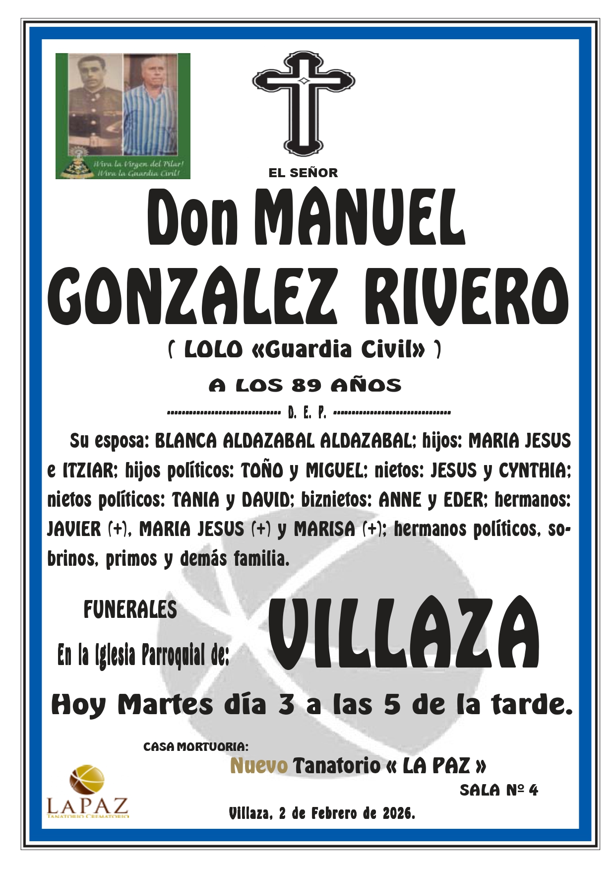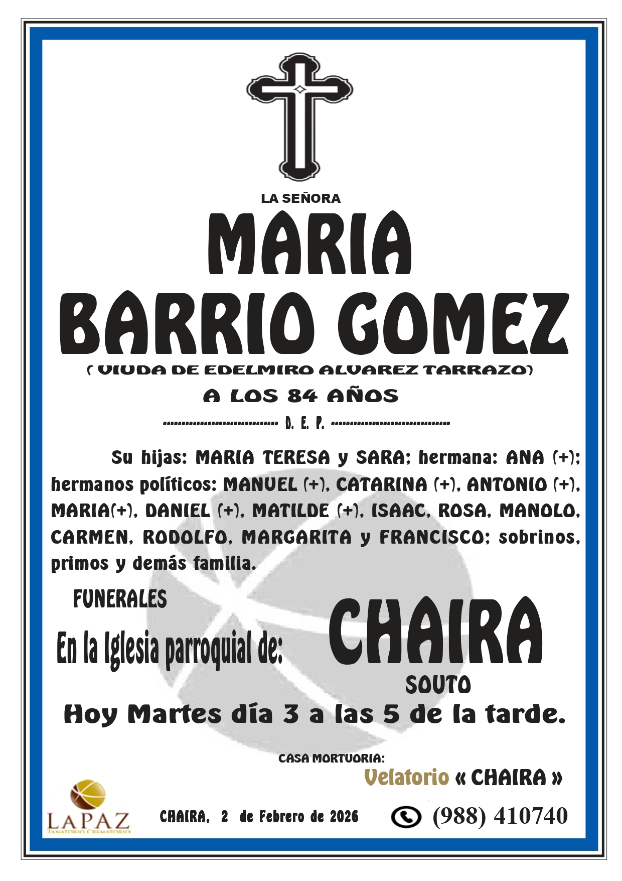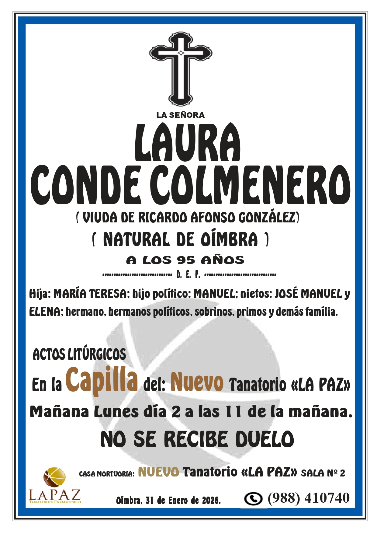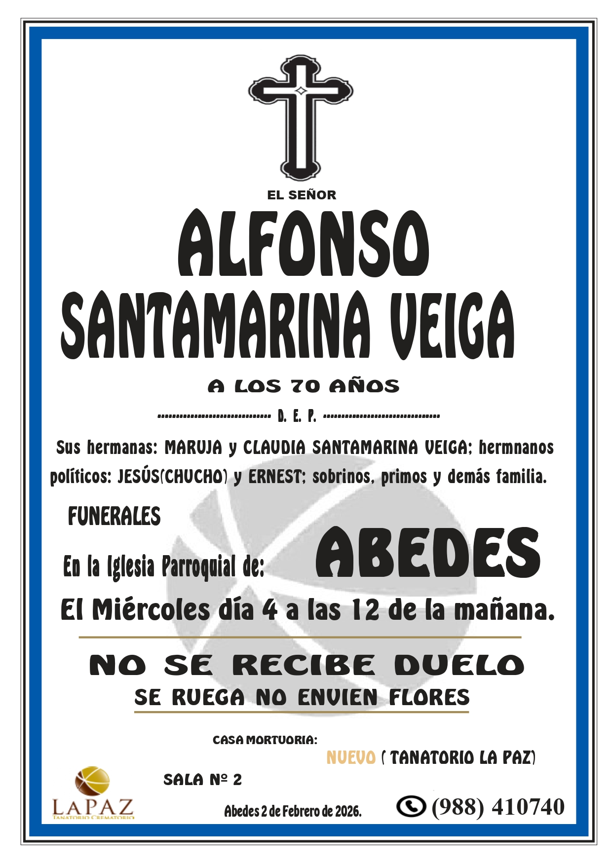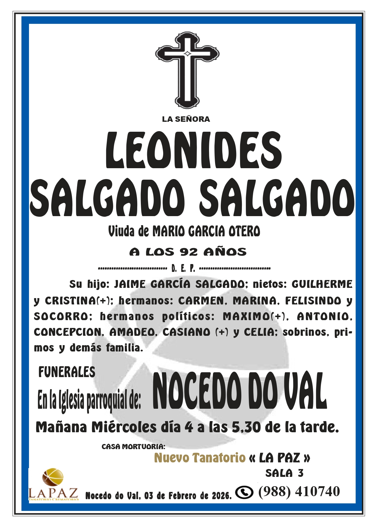 Floristería Encargos: 988 317 333 Qué hacer ante una defunción Atención 24 horas 988 410 740 Nueva aplicación de Funeraria La Paz Descarga gratuita para tu móvil Android o Iphone Nuestras instalaciones contarán en breve con un nuevo enlace a la carretera N-532, y desde el mismo cruce 1,5 km a la autovía A-52 Nuevo tanatorio crematorio de Pazos - Verín Funeraria La Paz pone a su disposición modernas instalaciones para ofrecer un servicio integral Esquelas LEONIDES SALGADO SALGADO- NOCEDO DO VAL- NUEVO TANATORIO «LA PAZ» DON MANUEL GONZALEZ RIVERO – VILLAZA MARIA BARRIO GOMEZ – A CHAIRA ALFONSO SANTAMARINA VEIGA – ABEDES LAURA CONDE COLMENERO – CAPILLA NUEVO TANATORIO «LA PAZ»