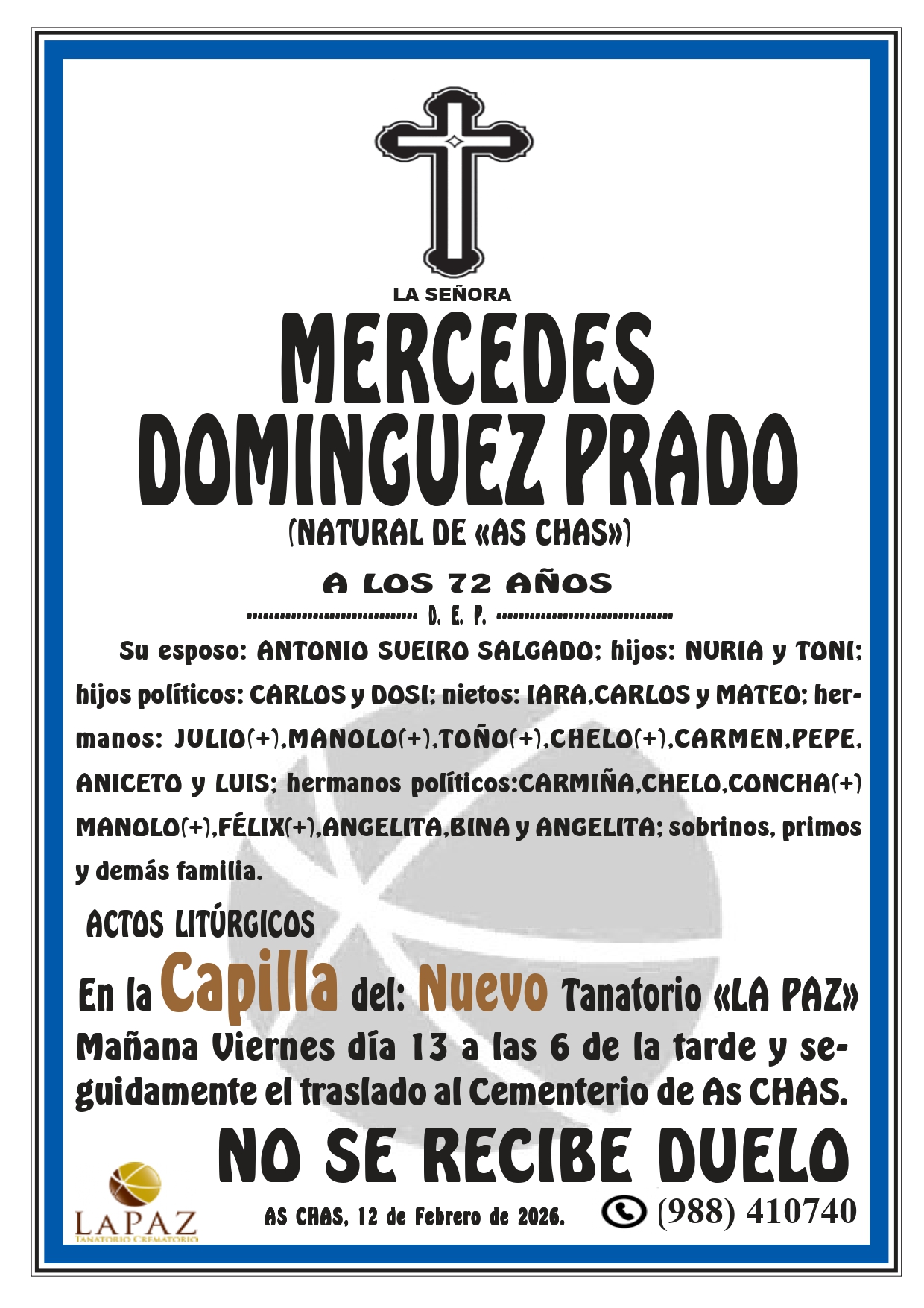 Floristería Encargos: 988 317 333 Qué hacer ante una defunción Atención 24 horas 988 410 740 Nueva aplicación de Funeraria La Paz Descarga gratuita para tu móvil Android o Iphone Nuestras instalaciones contarán en breve con un nuevo enlace a la carretera N-532, y desde el mismo cruce 1,5 km a la autovía A-52 Nuevo tanatorio crematorio de Pazos - Verín Funeraria La Paz pone a su disposición modernas instalaciones para ofrecer un servicio integral Esquelas NUEVO TANATORIO «LA PAZ» – MERCEDES DOMINGUEZ PRADO – CAPILLA NUEVO TANATORIO «LA PAZ»