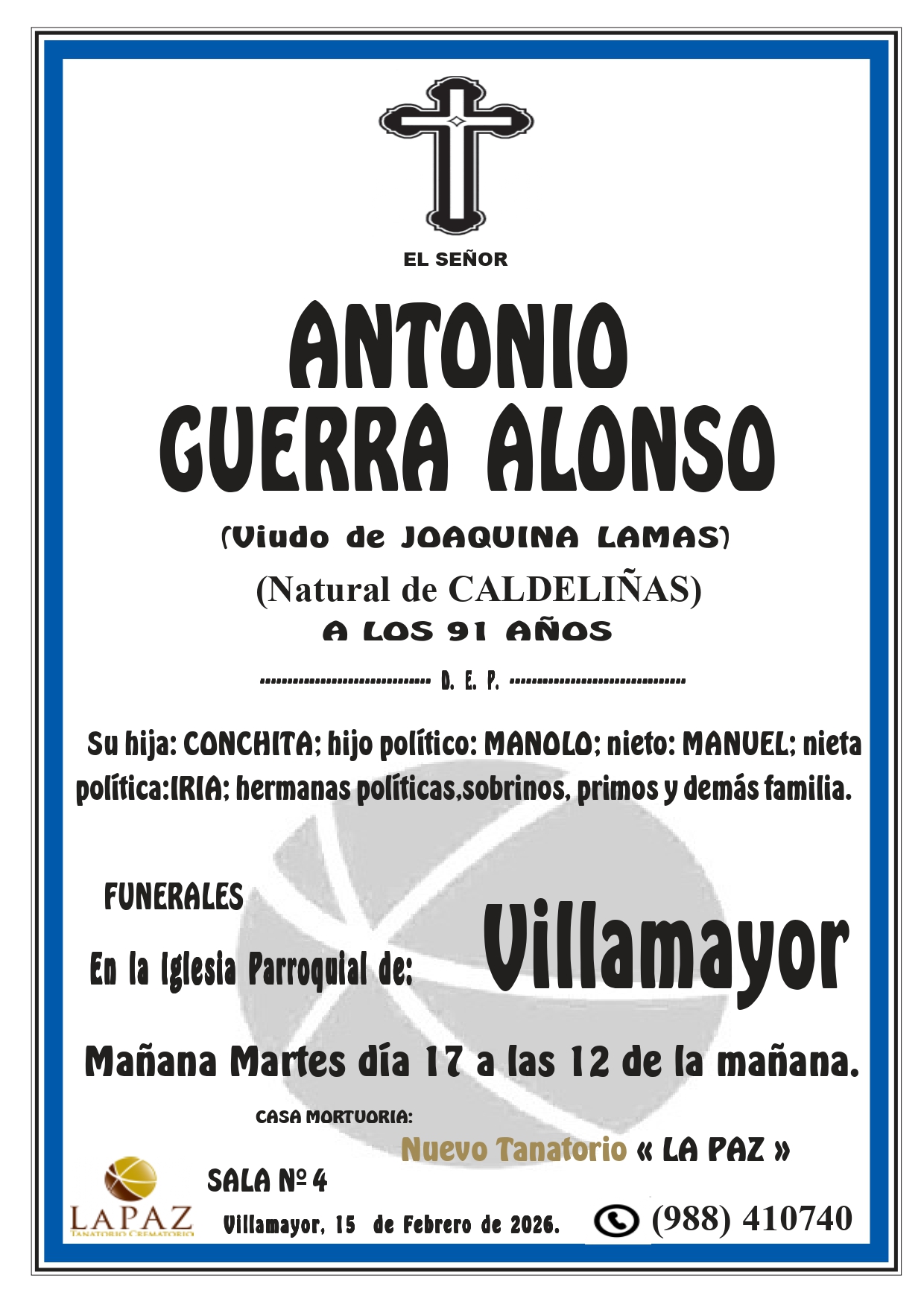 Floristería Encargos: 988 317 333 Qué hacer ante una defunción Atención 24 horas 988 410 740 Nueva aplicación de Funeraria La Paz Descarga gratuita para tu móvil Android o Iphone Nuestras instalaciones contarán en breve con un nuevo enlace a la carretera N-532, y desde el mismo cruce 1,5 km a la autovía A-52 Nuevo tanatorio crematorio de Pazos - Verín Funeraria La Paz pone a su disposición modernas instalaciones para ofrecer un servicio integral Esquelas NUEVO TANATORIO «LA PAZ» – ANTONIO GUERRA ALONSO – VILLAMAYOR CANDIDA DIZ VIEIRA – CASAS DOS MONTES JOSE MARTINEZ CORTES – A GUDIÑA ALBINO PÉREZ LÓPEZ – TREZ