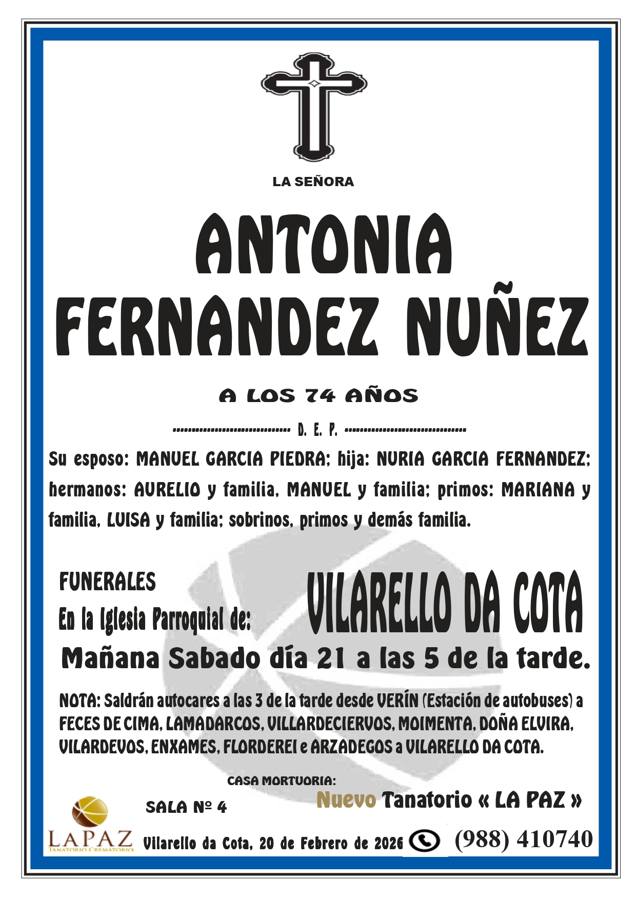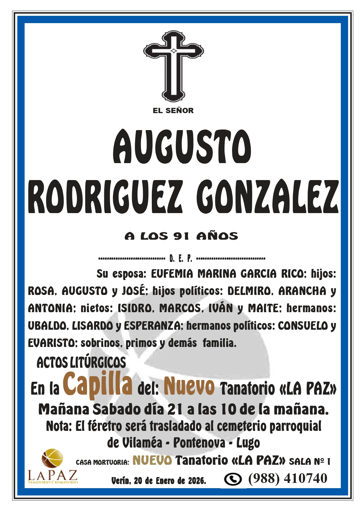 Floristería Encargos: 988 317 333 Qué hacer ante una defunción Atención 24 horas 988 410 740 Nueva aplicación de Funeraria La Paz Descarga gratuita para tu móvil Android o Iphone Nuestras instalaciones contarán en breve con un nuevo enlace a la carretera N-532, y desde el mismo cruce 1,5 km a la autovía A-52 Nuevo tanatorio crematorio de Pazos - Verín Funeraria La Paz pone a su disposición modernas instalaciones para ofrecer un servicio integral Esquelas NUEVO TANATORIO «LA PAZ» – AUGUSTO RODRIGUEZ GONZALEZ – CAPILLA NUEVO TANATORIO «LA PAZ» ANTONIA FERNÁNDEZ NUÑEZ – VILARELLO DA COTA