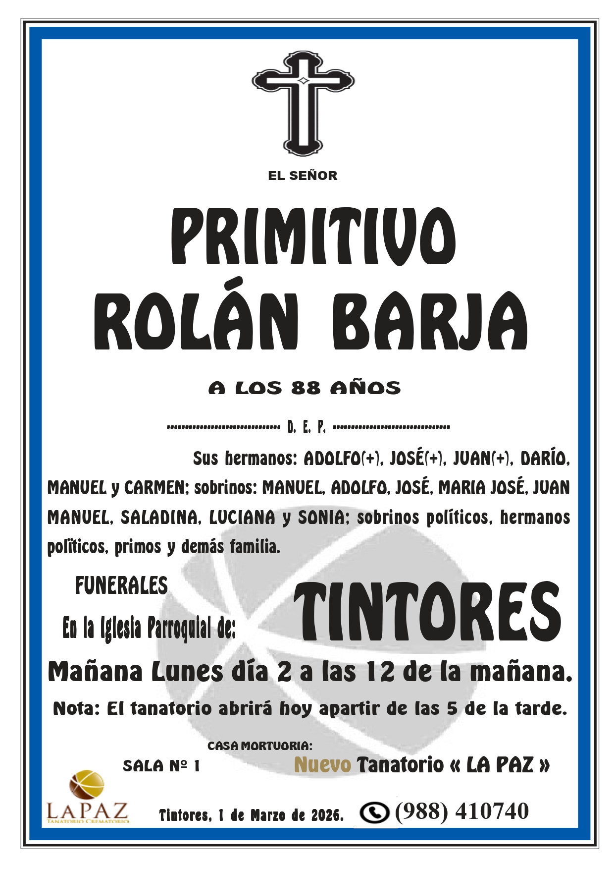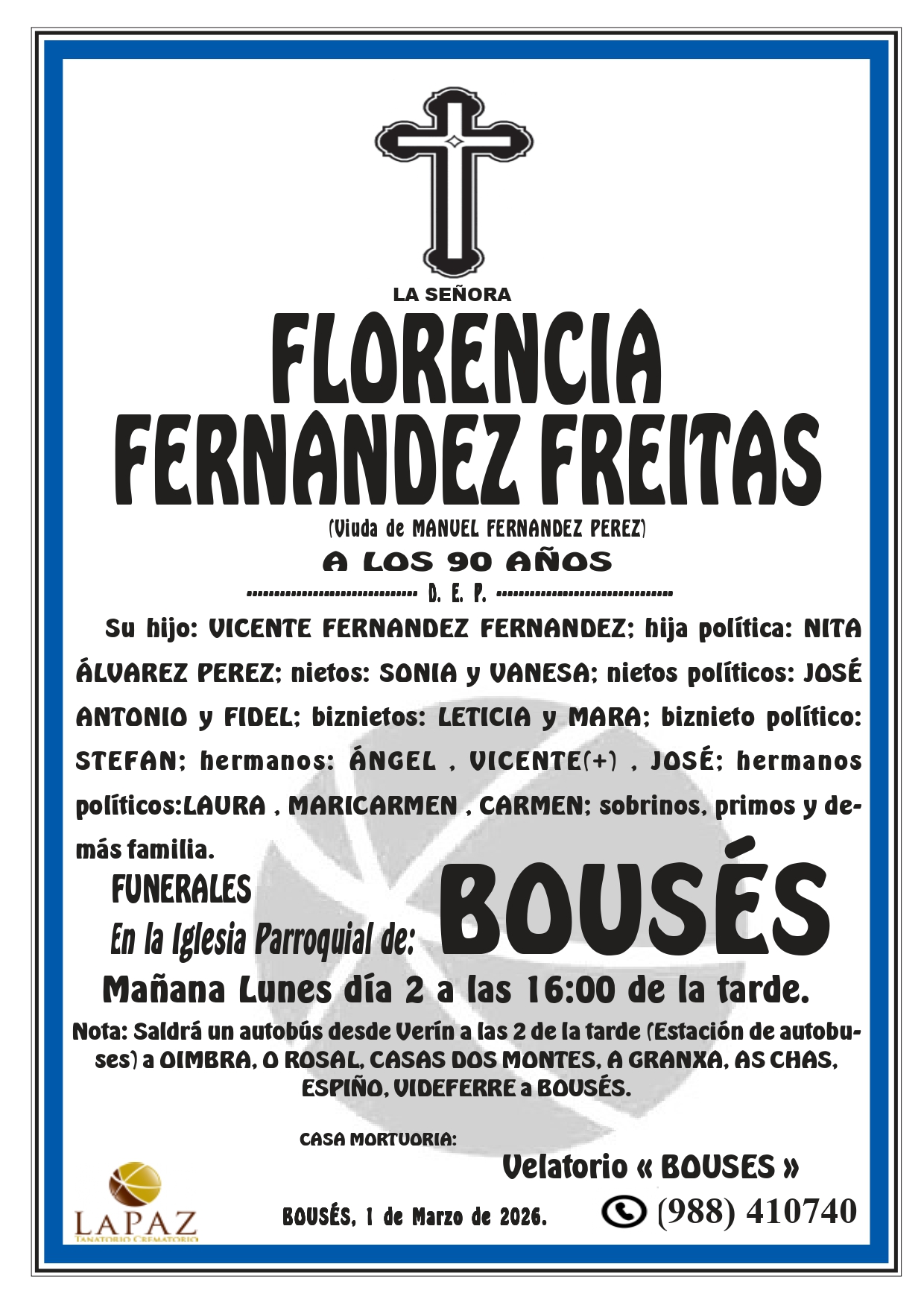 Floristería Encargos: 988 317 333 Qué hacer ante una defunción Atención 24 horas 988 410 740 Nueva aplicación de Funeraria La Paz Descarga gratuita para tu móvil Android o Iphone Nuestras instalaciones contarán en breve con un nuevo enlace a la carretera N-532, y desde el mismo cruce 1,5 km a la autovía A-52 Nuevo tanatorio crematorio de Pazos - Verín Funeraria La Paz pone a su disposición modernas instalaciones para ofrecer un servicio integral Esquelas FLORENCIA FERNANDEZ FREITAS – BOUSES FLORENCIA FERNANDEZ FREITAS – BOUSES NUEVO TANATORIO «LA PAZ» PRIMITIVO ROLÁN BARJA – TINTORES