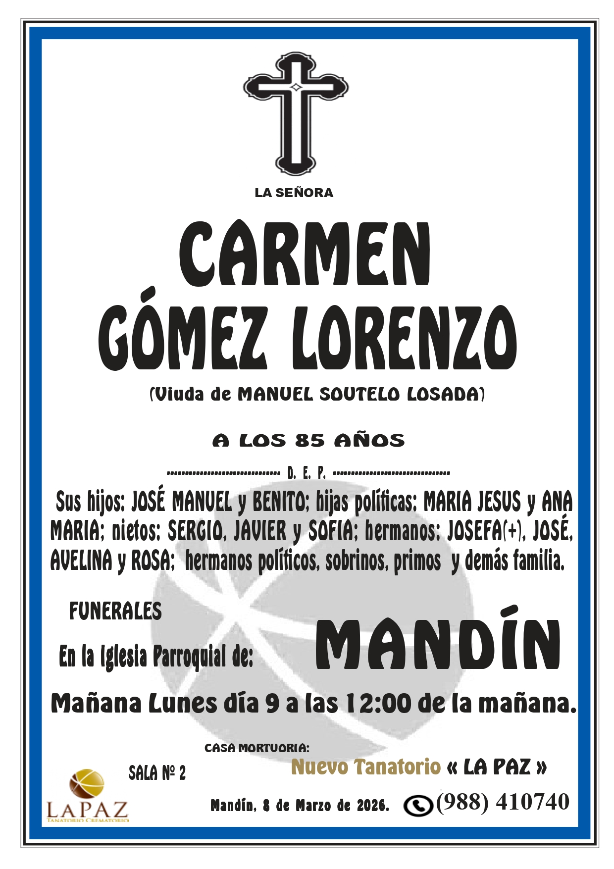 Floristería Encargos: 988 317 333 Qué hacer ante una defunción Atención 24 horas 988 410 740 Nueva aplicación de Funeraria La Paz Descarga gratuita para tu móvil Android o Iphone Nuevo tanatorio crematorio de Pazos - Verín Funeraria La Paz pone a su disposición modernas instalaciones para ofrecer un servicio integral Esquelas CARMEN GÓMEZ LORENZO
