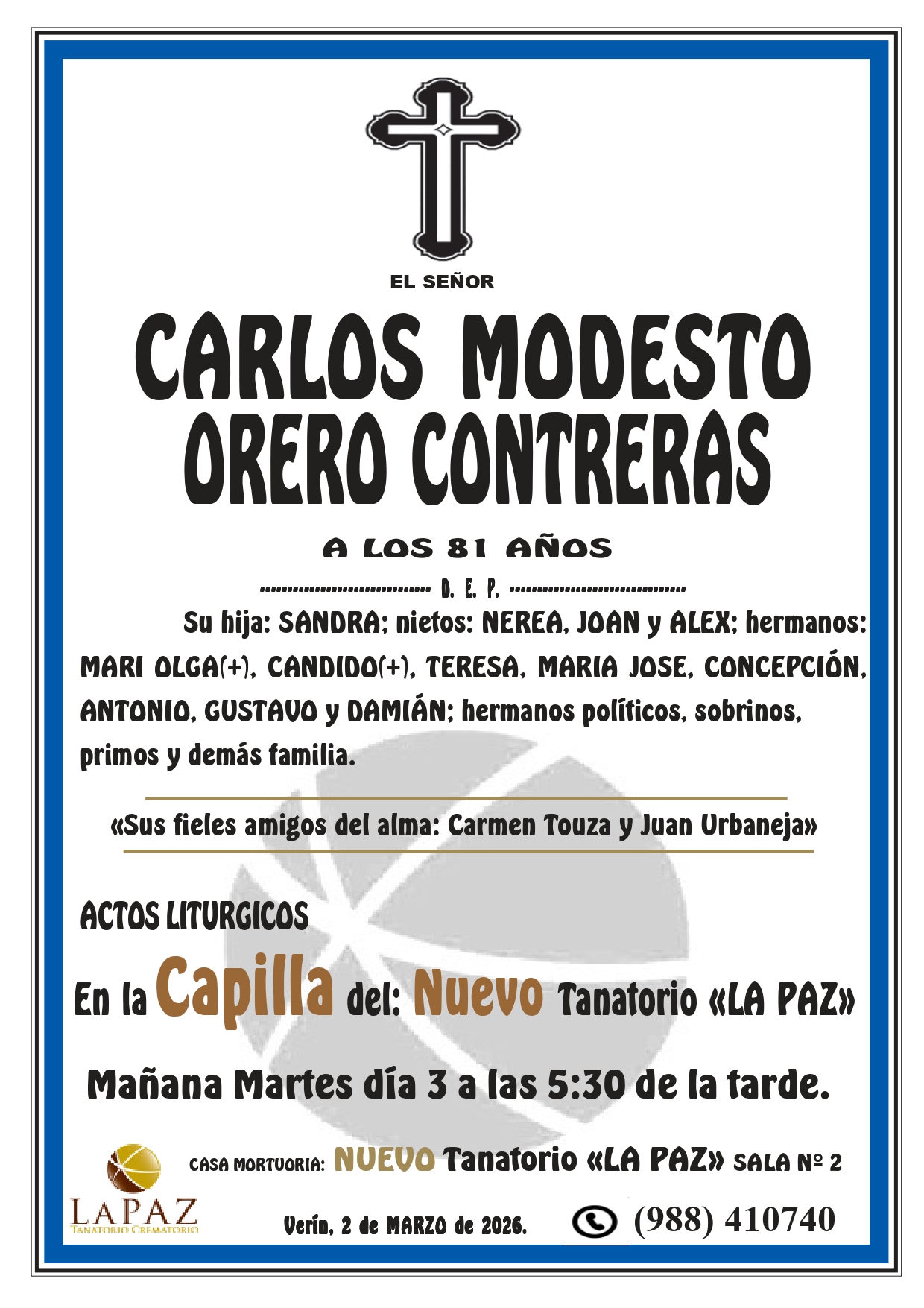 Floristería Encargos: 988 317 333 Qué hacer ante una defunción Atención 24 horas 988 410 740 Nueva aplicación de Funeraria La Paz Descarga gratuita para tu móvil Android o Iphone Nuestras instalaciones contarán en breve con un nuevo enlace a la carretera N-532, y desde el mismo cruce 1,5 km a la autovía A-52 Nuevo tanatorio crematorio de Pazos - Verín Funeraria La Paz pone a su disposición modernas instalaciones para ofrecer un servicio integral Esquelas NUEVO TANATORIO «LA PAZ» – CARLOS MODESTO ORERO CONTRERAS – CAPILLA NUEVO TANATORIO «LA PAZ» FLORENCIA FERNANDEZ FREITAS – BOUSES FLORENCIA FERNANDEZ FREITAS – BOUSES NUEVO TANATORIO «LA PAZ» PRIMITIVO ROLÁN BARJA – TINTORES